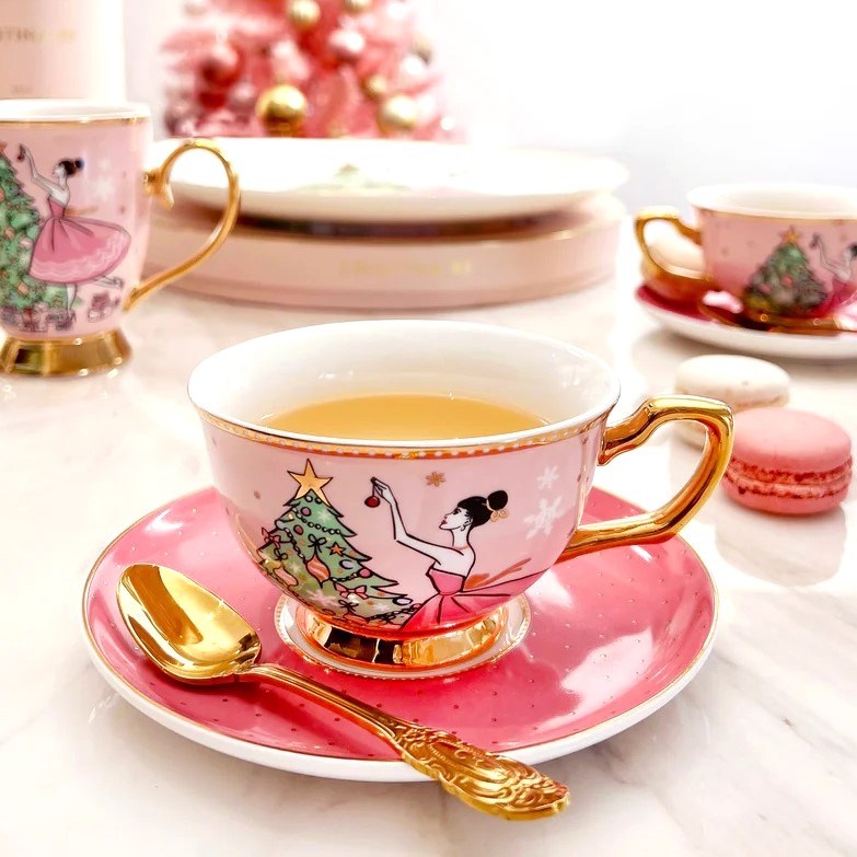 Det underbara designermärket Christina Re har som specialitet att dekorera sina muggar, koppar och tallrikar med en guldbård. Men inte vilken guldbård som helst, utan en guldbård av 24 karats guld. Vi är otroligt stolta över att få saluföra deras julkopp, en rosa makalös bakelse med retromotiv kallat “La Belle Noel” som flörtar med 1950-talet och som får vem som helst på gott humör. Visst är den underbar?