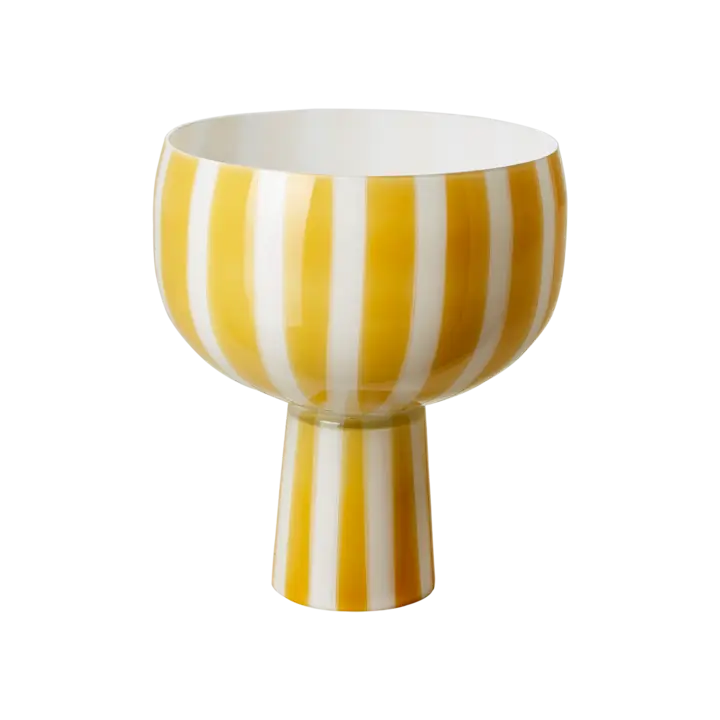 När man serverar sitt julgodis är det viktigt att tänka på att servera på ett iögonfallande sätt. I och för sig kanske man inte vill att gästerna ska glufsa i sig allt godiset innan de går hem och lämna kvar lite till dig att gå och nibbla på lite när andan faller på men det är ju ändå roligt att fresta och ge de du bjudit en upplevelse, både för öga och tand. Det är väldigt olika hur man tänker krinig vad som räknas som “julporslin” eller inte men vår rejäla skål med gula och vita ränder höjer sig lite över genomsnittet av skålar på mer än ett sätt. De gula ränderna passar lätt som en plätt in bland alla guldkanter och glitterkulor och tänk dig den här fylld med Droste eller pepparkaksdumle. Ojojoj. En succé! Hade det funnits gula polskagrisar hade det så klart varit det ultimata, men det finns det kanske?