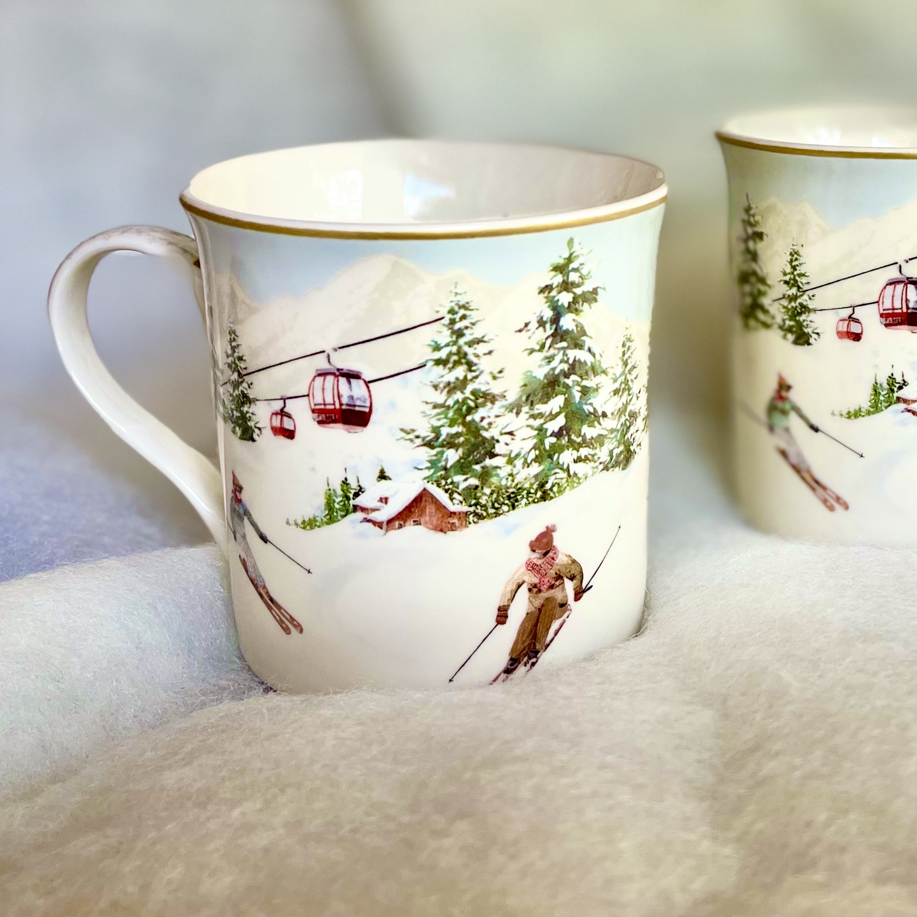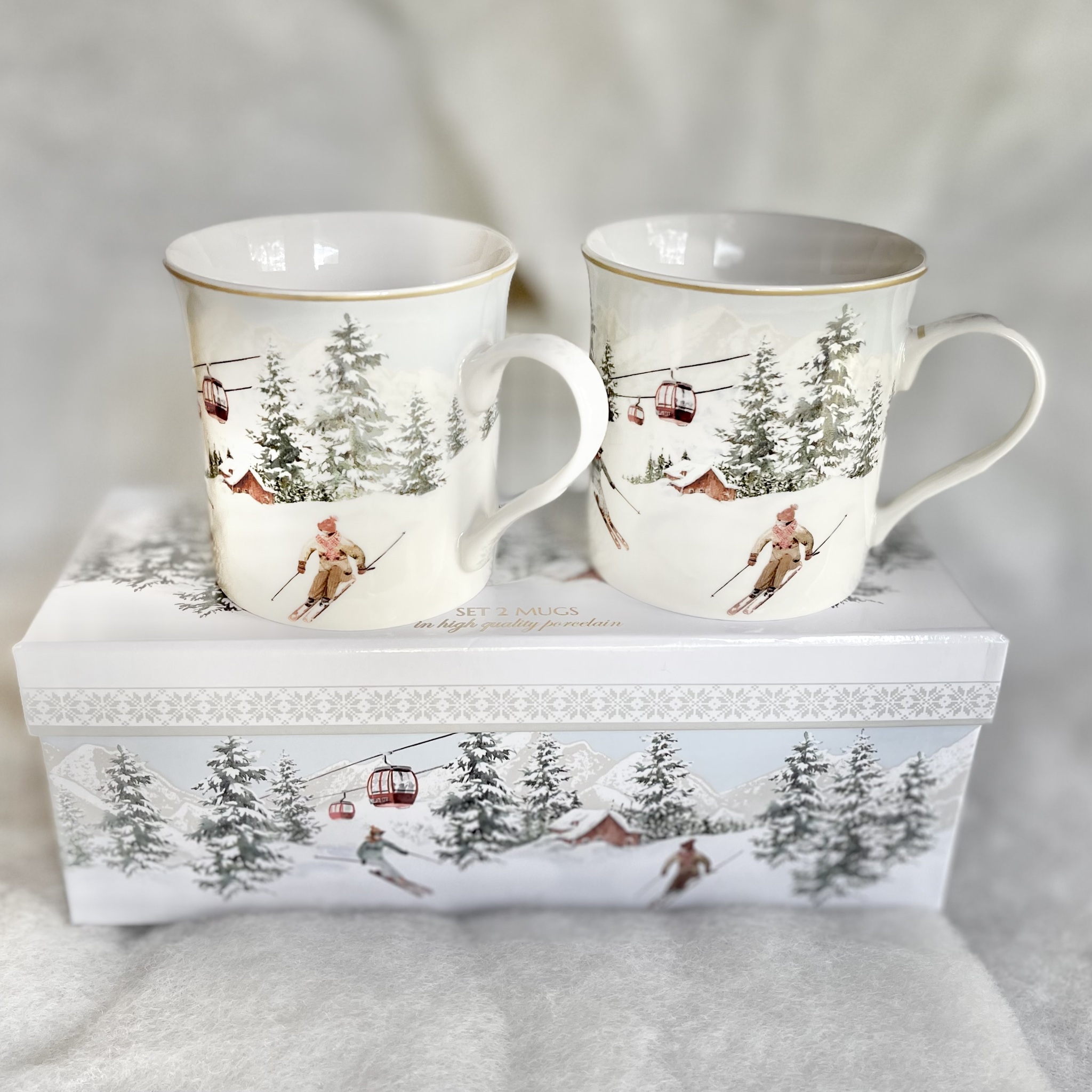 Oumbärliga i vintertid är dessa vackra muggar med skidåkare som swishar förbi, snötäckta granar och liftar. Levereras i 2-pack i en glansig och lyxig box som är fin att spara. Matcha med assietterna i
