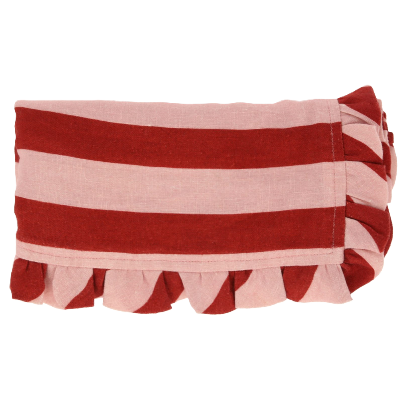 Maxa din dukning året om eller varför inte din juldukning med dessa fabulösa linneservetter i röd/rosarandigt linne, dekorerad med vacker volang. Mått 45,7 x 45,7 cm.