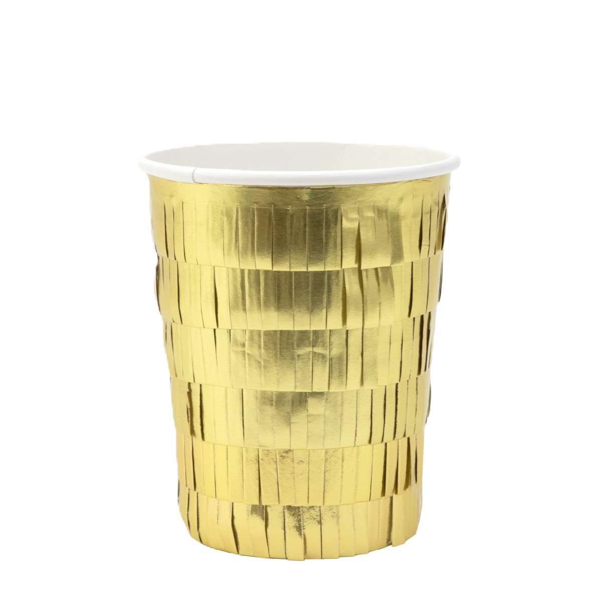 Festligt och praktiskt i ett! 8-pack pappersmuggar med guldfransar gör livet lite lättare och garanterat mer glamouröst. Varje mugg rymmer 256ml.