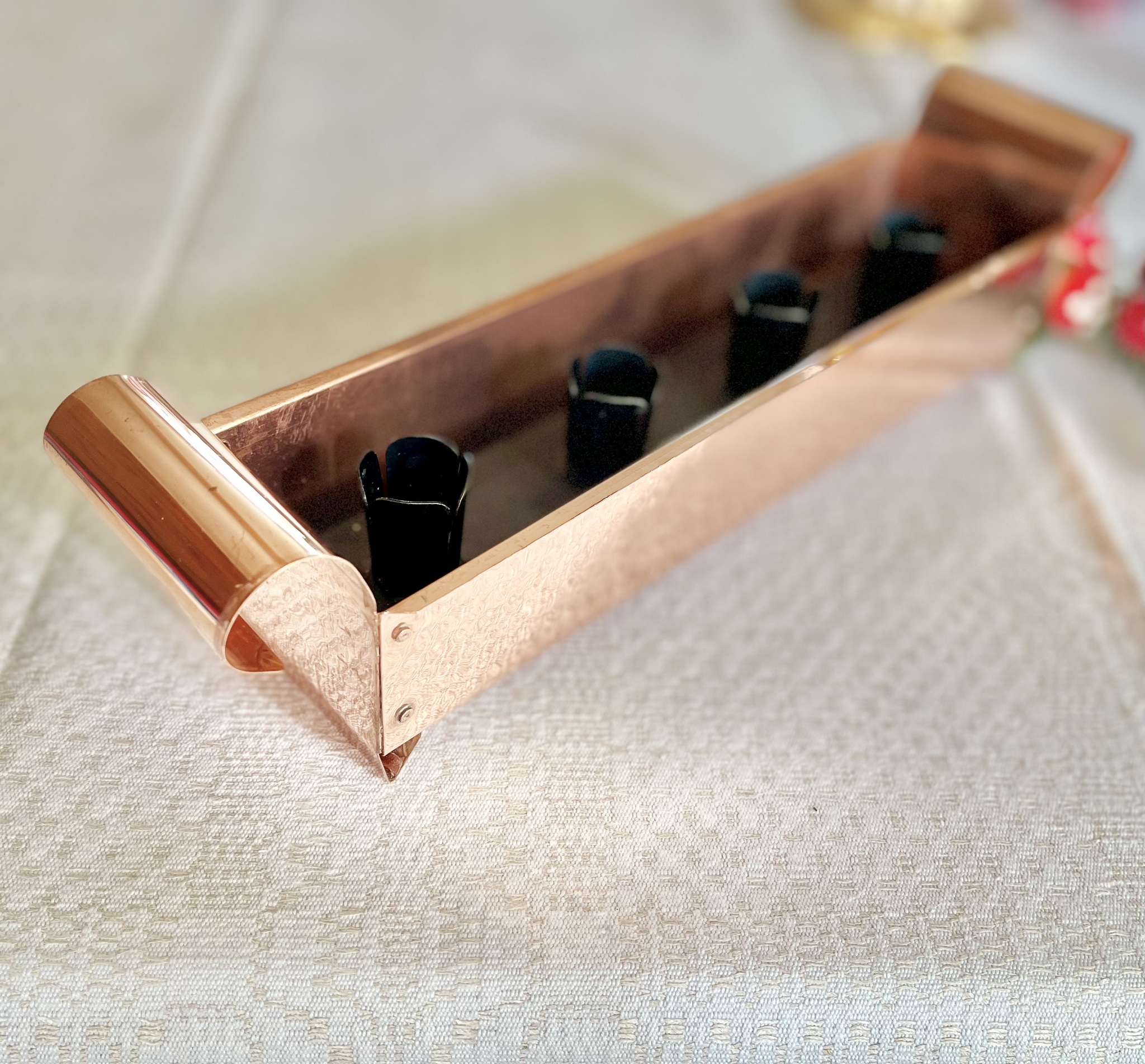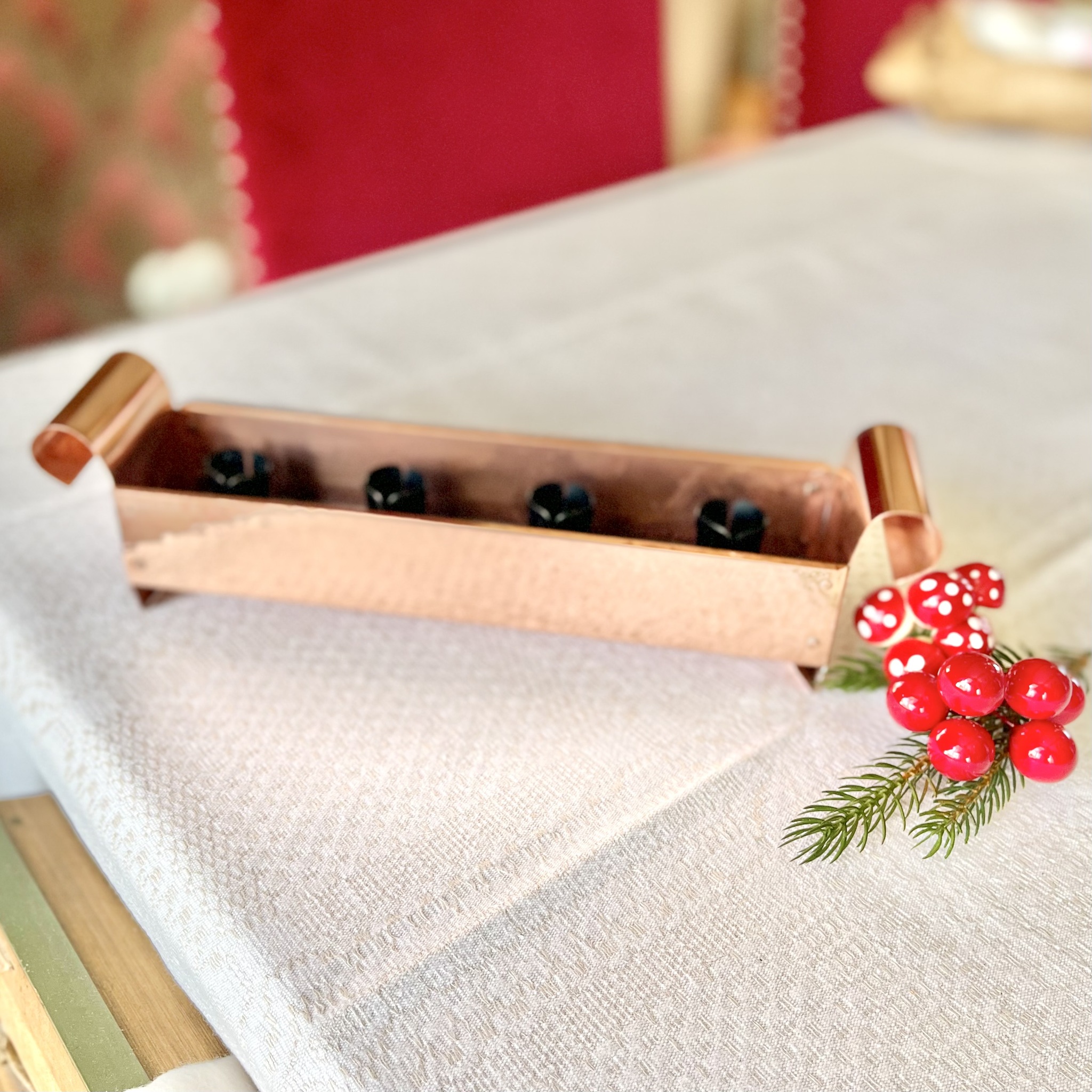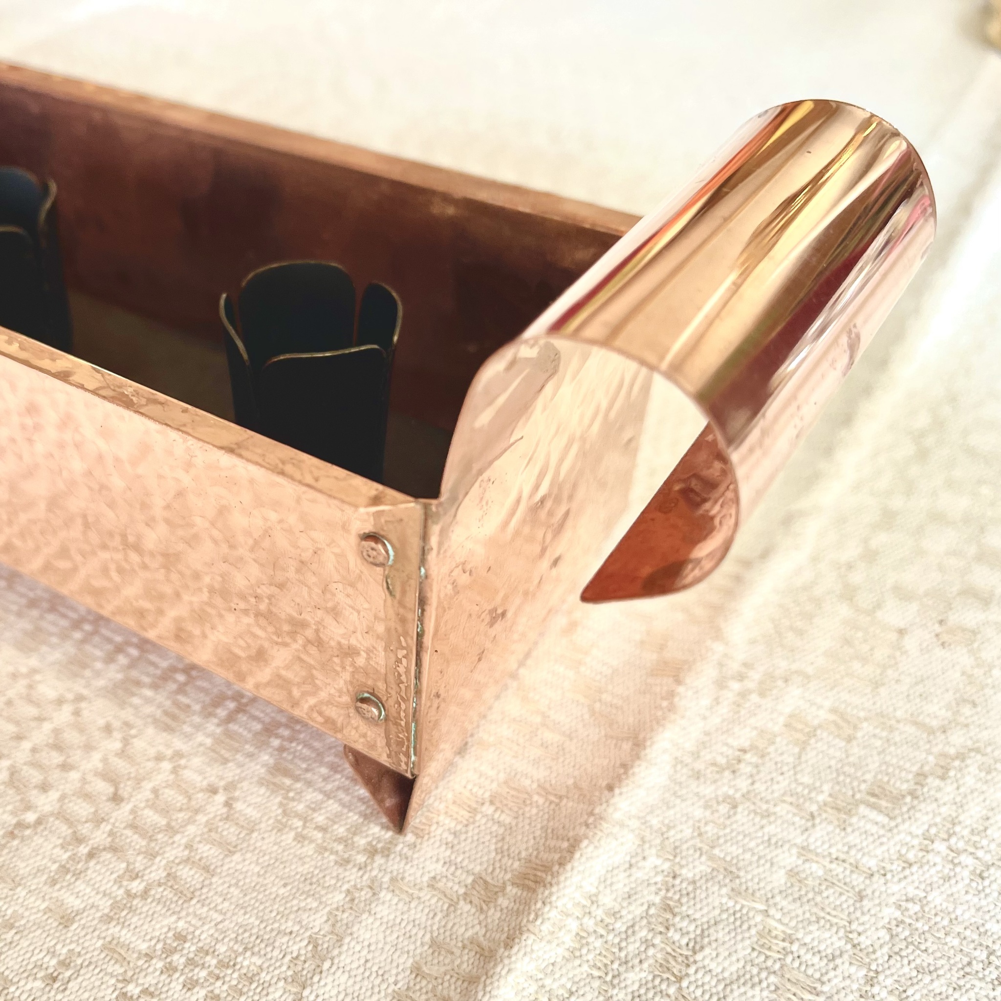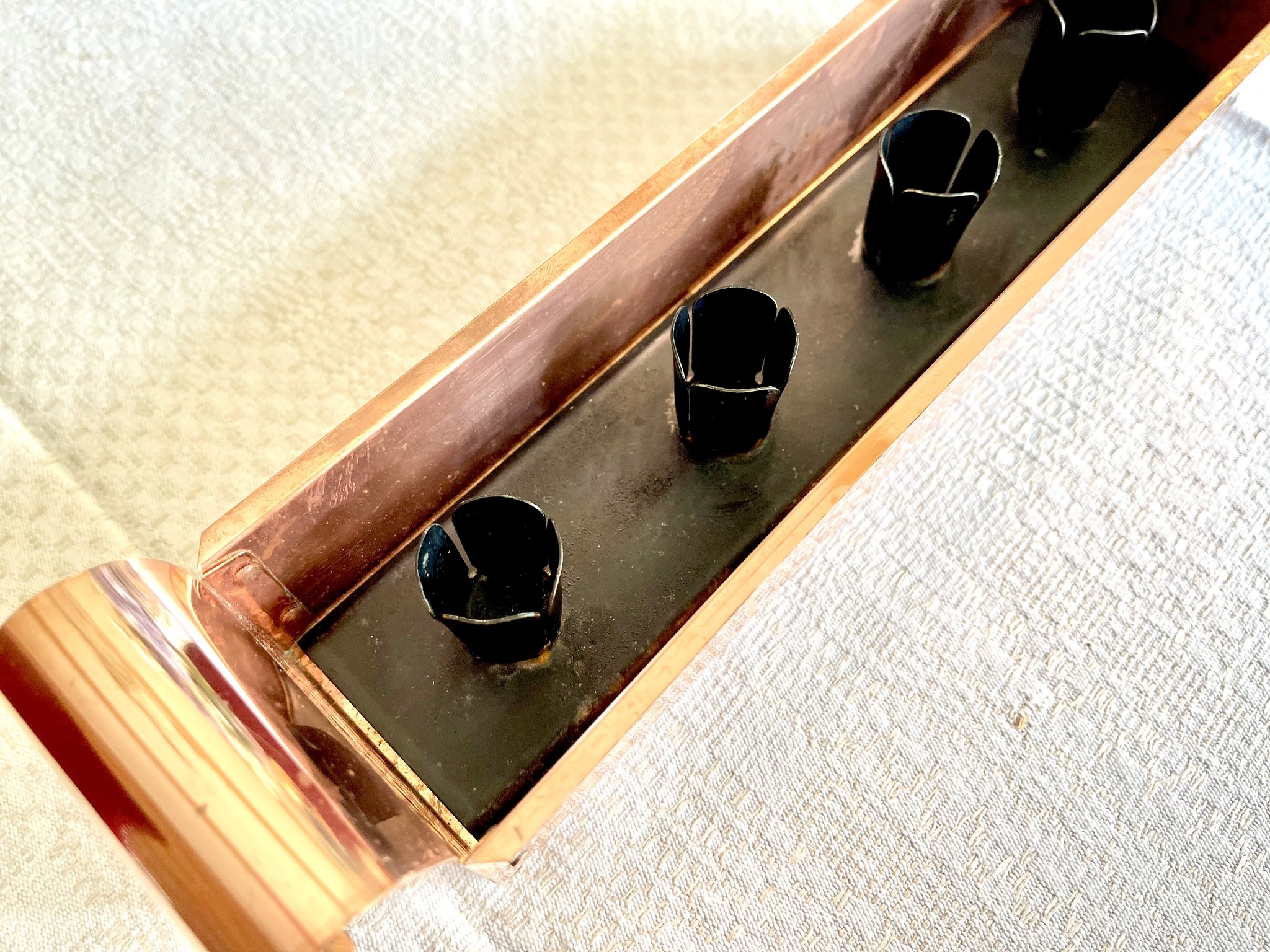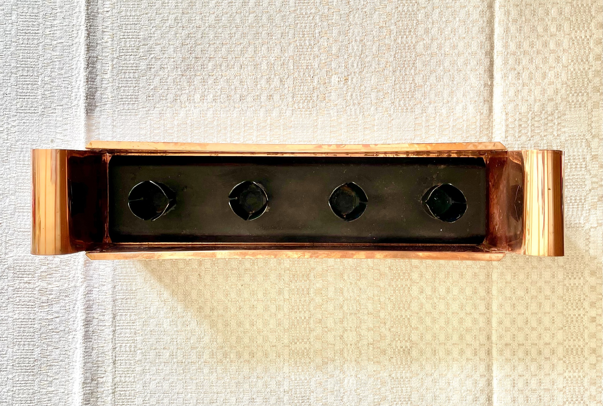 Klassisk adventsljusstake av koppar. Bruksslitage, mindre repor. Längd 32 cm, bredd 6 cm, höjd 8,5 cm.