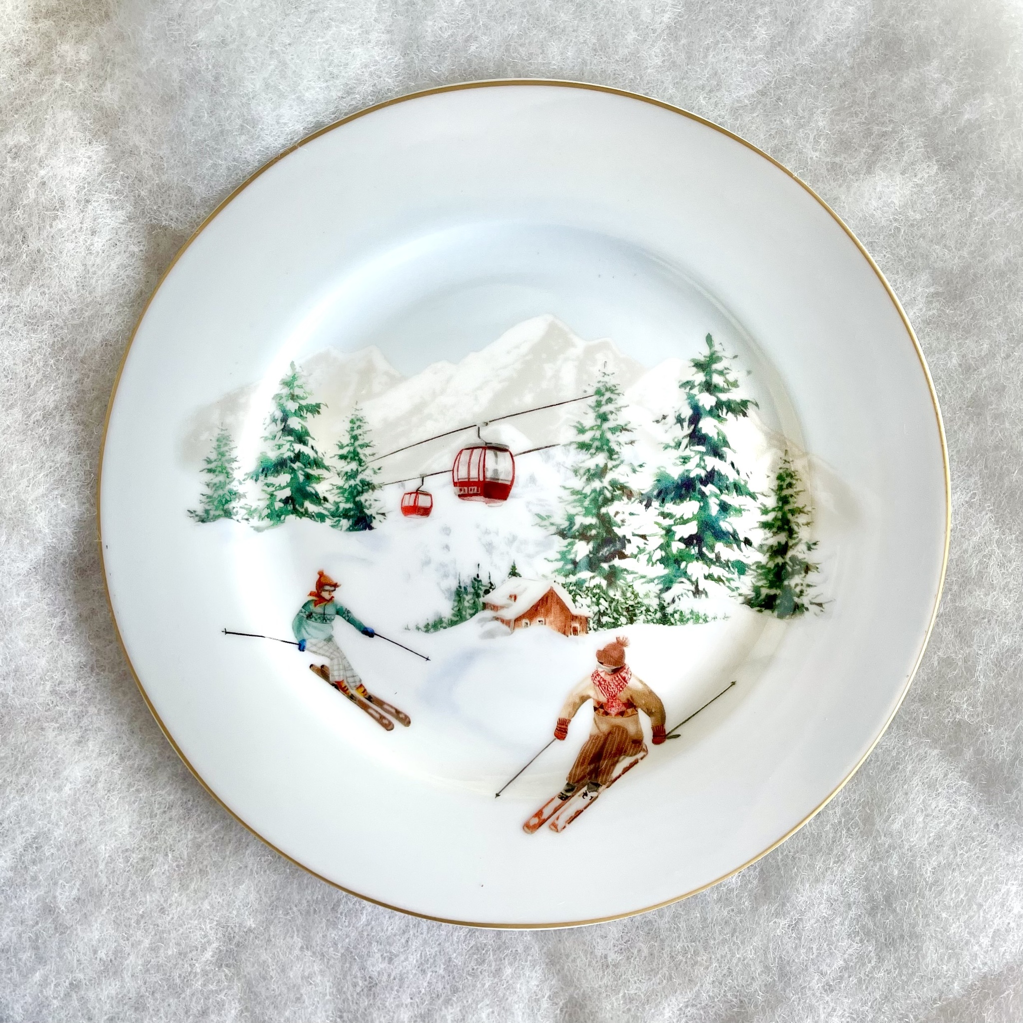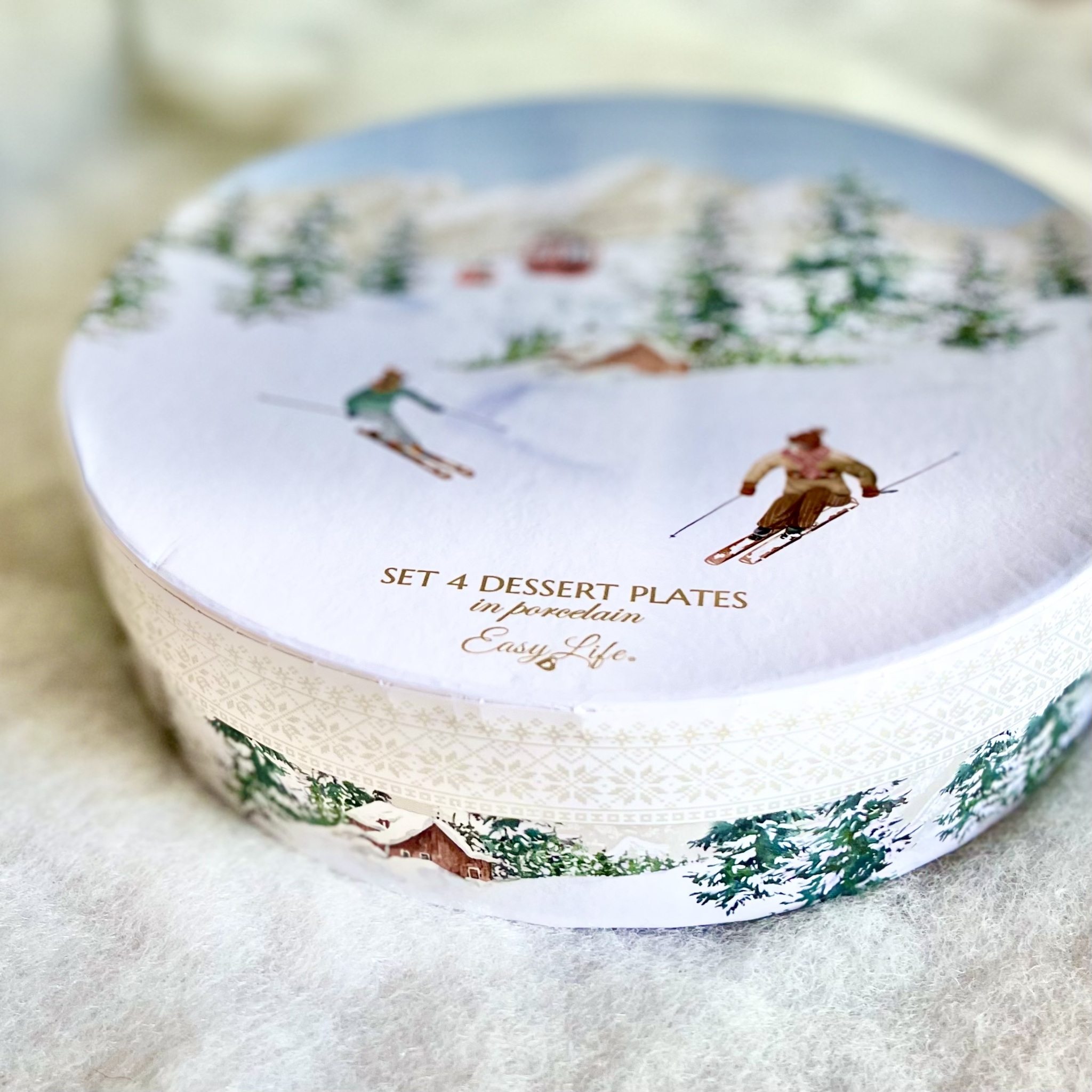 Set med fyra assietter i serien ?Skiing? som levereras i vacker presentask. Matcha upp med muggarna i samma serie och vinterkvällarna efter sista åket är räddade. Tål maskindisk och micro. Diameter 19