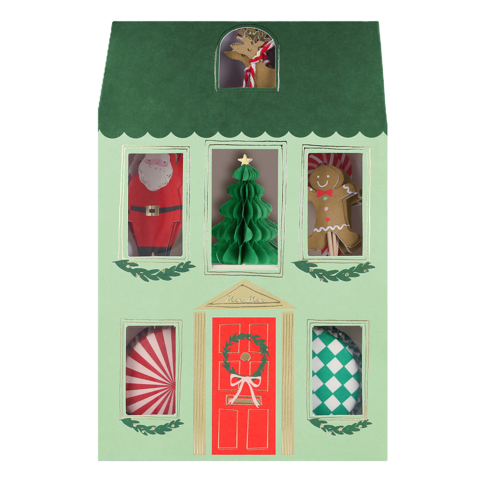 Helt underbart litet hus av papper som innehåller cupcakeformar och dekorationer till dina smakliga kreationer. Innehåller 24 formar och 24 toppers i form av granar, tomtar, pepparkaksgubbar m.m. Mått