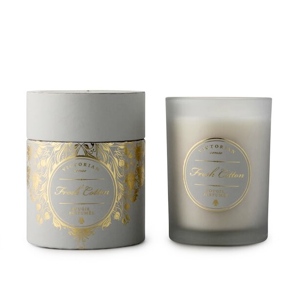 Victorian Sense Roundbox ?Fresh Cotton?. En elegant grå ljuskopp i frostat glas med en doft av nytvättad bomull. Brinntid 30 timmar. Lämna aldrig ett brinnande ljus obevakat. Håll borta från barn och djur. Glaset kan bli varmt, placera ljuset på en lämplig värmetålig yta. Underhåll ljuset och klipp av veken var tredje timme. Material: 90% sojavax, 5% doft, 5% vegetabilisk olja. Bredd 7.5 cm, höjd 8.5 cm.