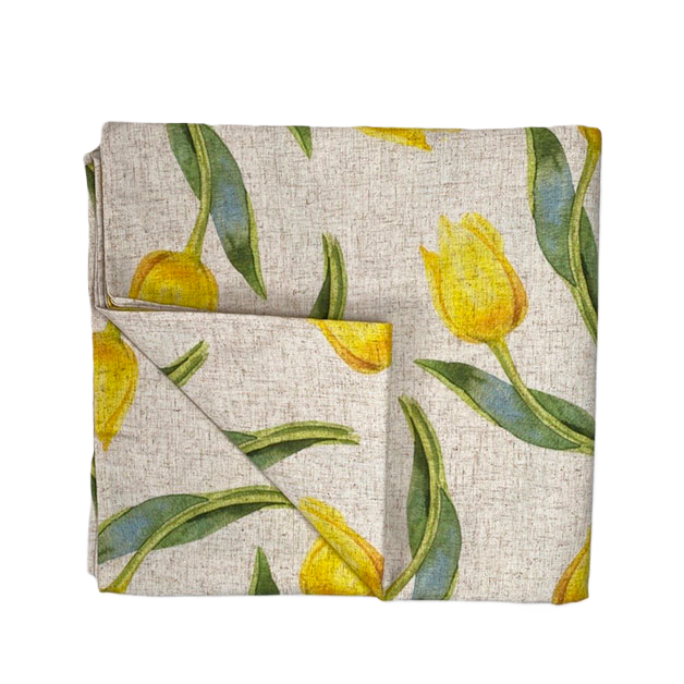 Nu blommar duken! Piffa vår- och påskbordet med gula tulpaner. Duken tvättas enkelt i maskin vid behov. Tillverkad i en polyesterkvalitet som har en känsla och struktur av linne. Mått 260 cm x 140 cm.