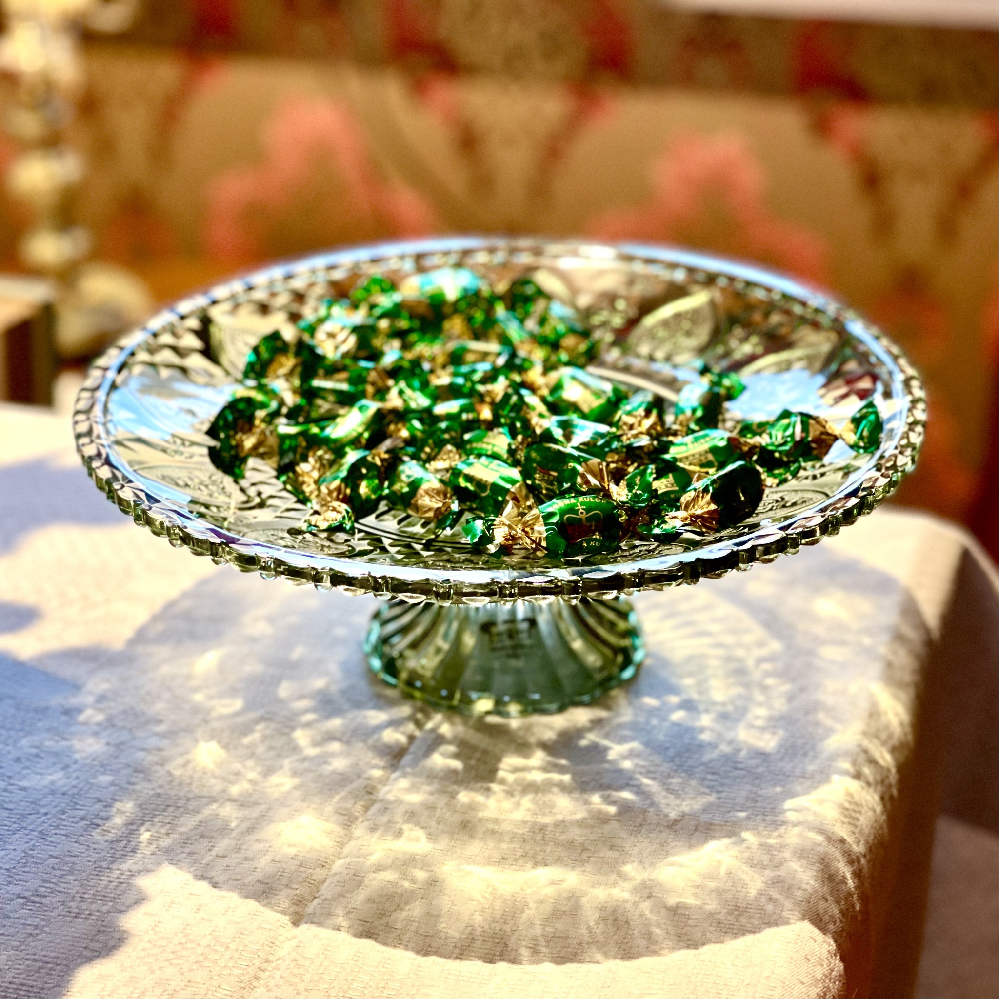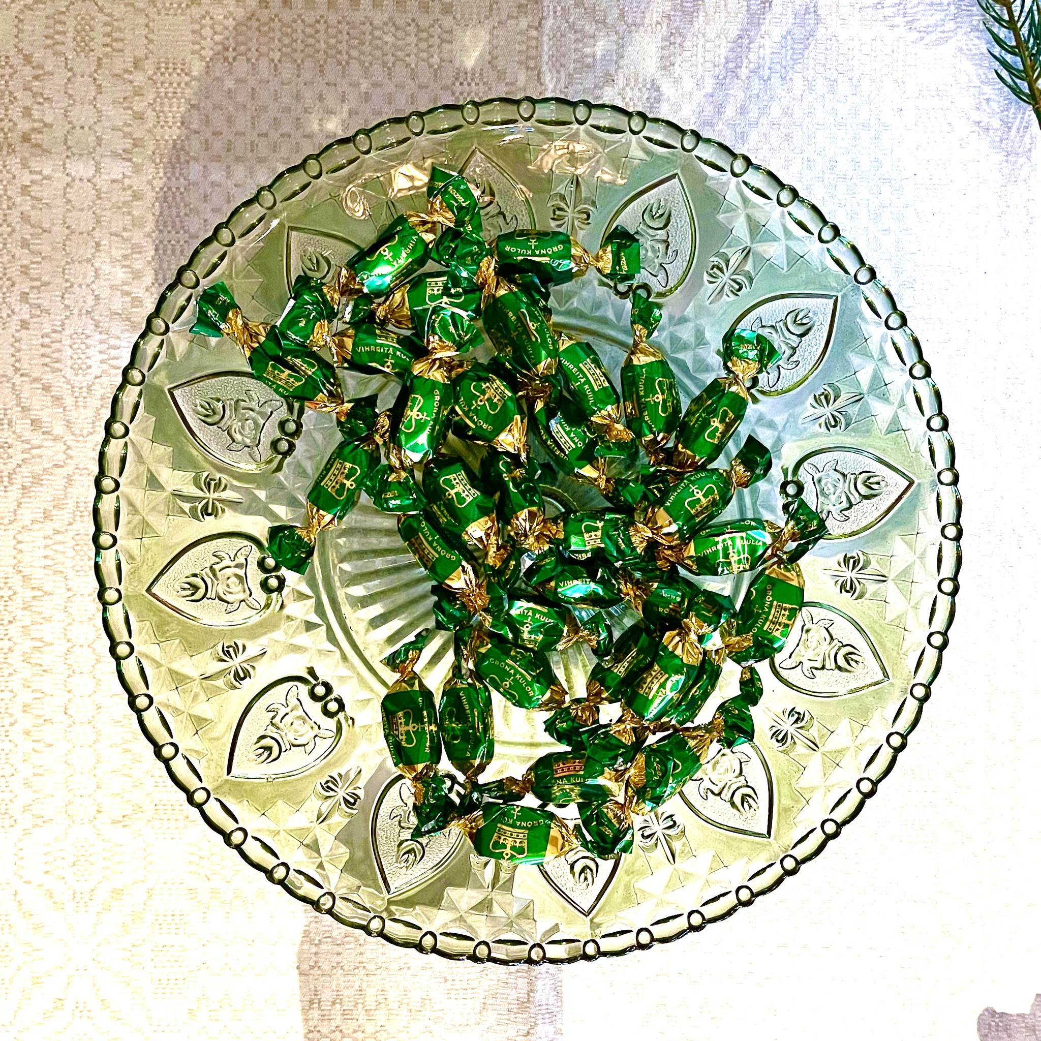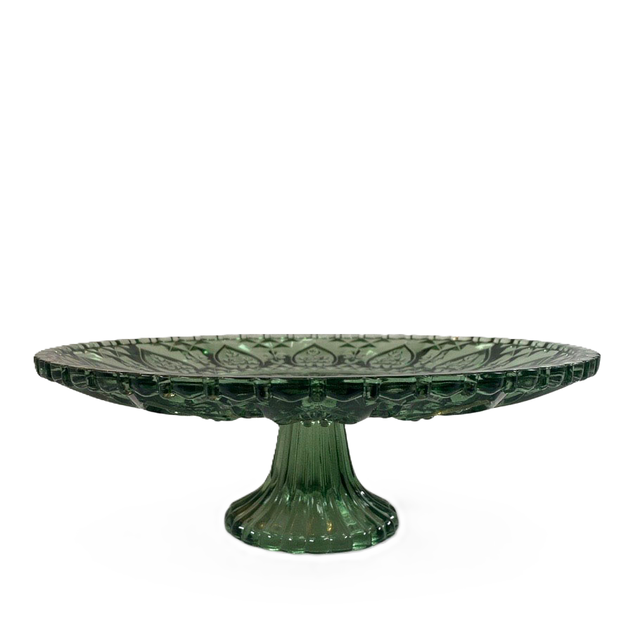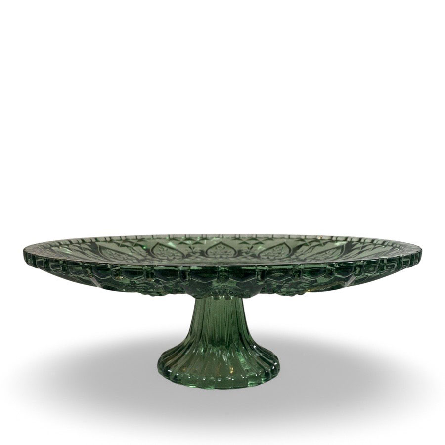 Klassiskt, romantiskt och elegant är detta fat på fot av grönt pressglas som passar utmärkt året runt men blir perfekt för julens läckerheter. Diameter 30 cm, höjd 10,5 cm.