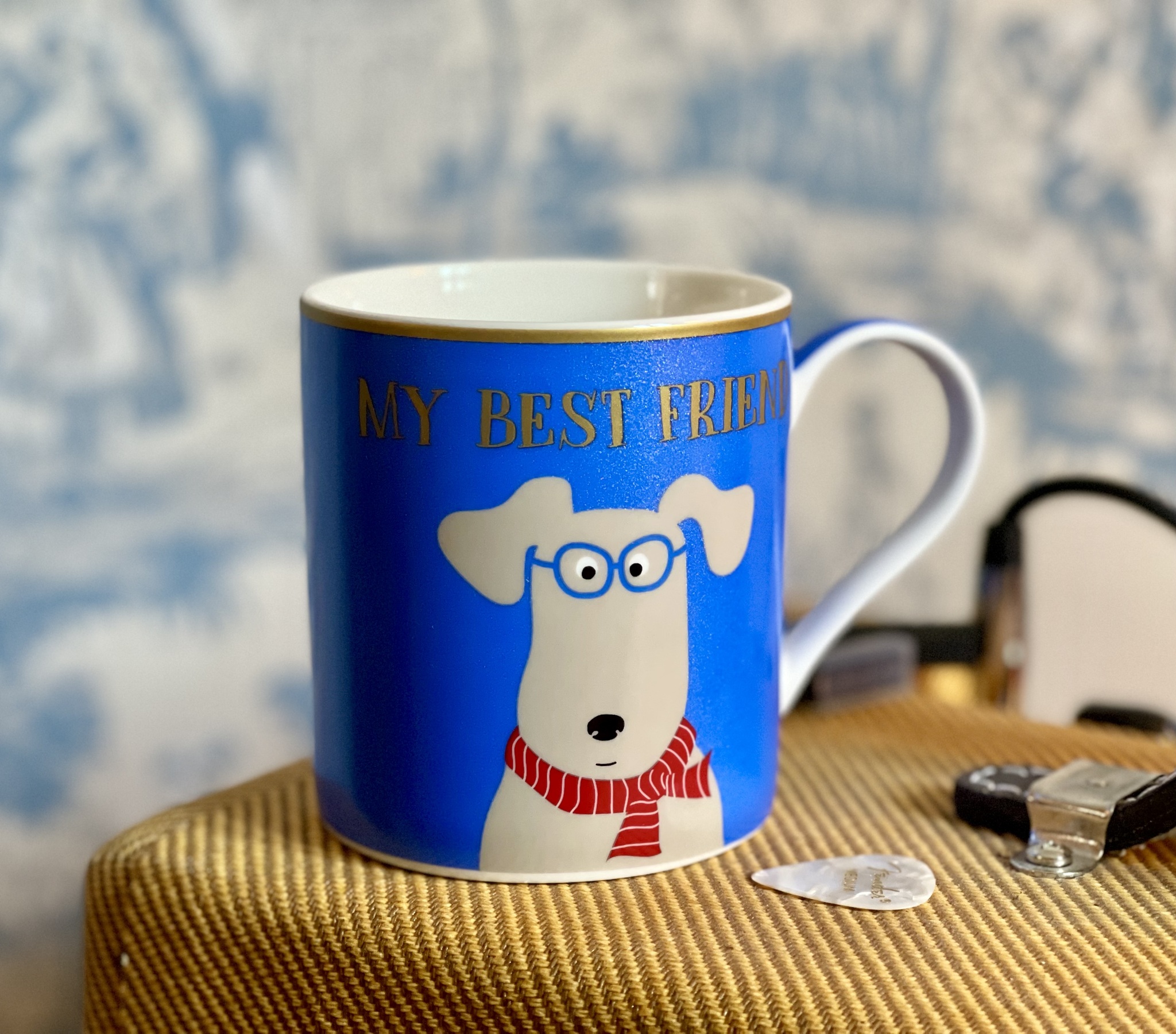 Världens gulligaste hundkompis avbildad på kopp av porslin. Den blå färgen glittrar lite på ett elegant sätt och överst står texten ?My best friend?. Tål maskindisk och micro. Rymmer 350 ml.