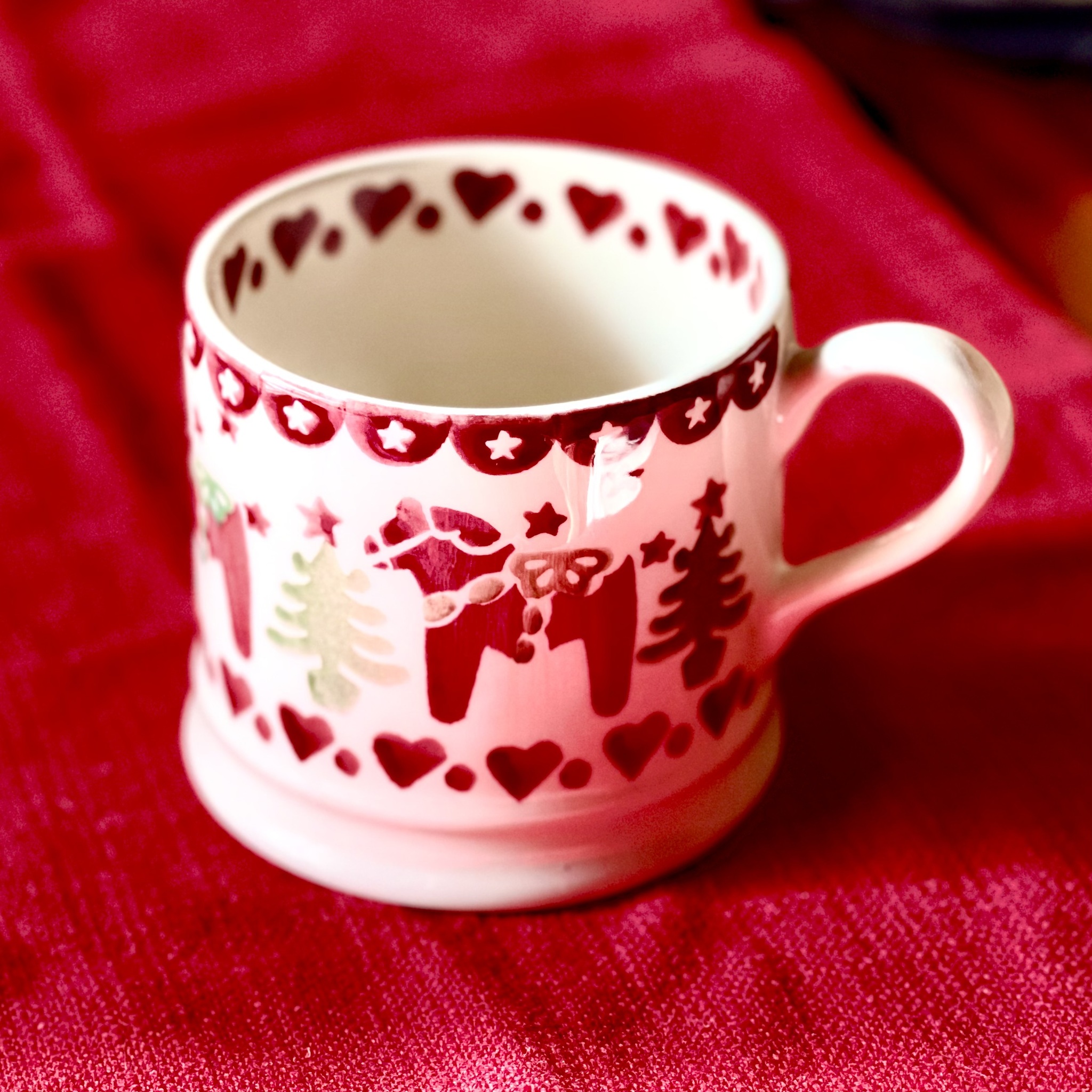 Underbar kopp av finaste porslin från Emma Bridgewater med mönster med dalahästar, granar och hjärtan. Detta är en så kallad NOS-produkt (New Old Stock) som innebär att produkten är ny och oanvänd men