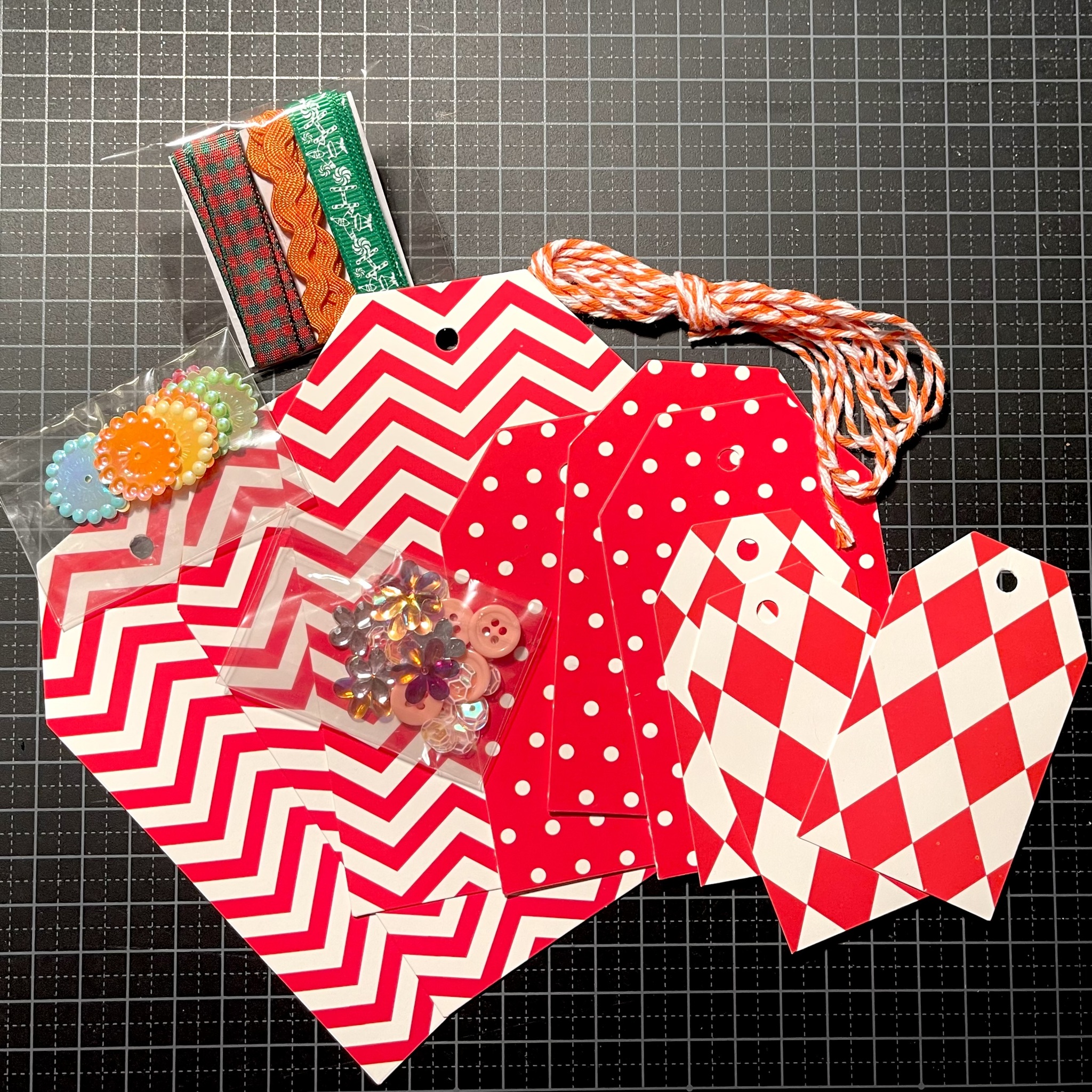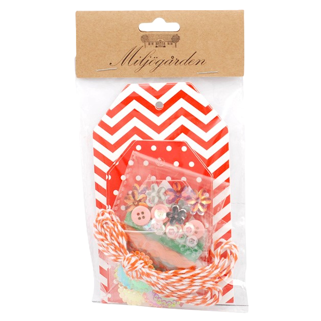 Kort – eller så kallade tags – att själv pyssla ihop och fästa på dina paket. Tre stora (13×8 cm), tre mellan (10×6 cm) och tre små (8×4,5 cm) med olika mönster som du pyntar med olika medföljande attiraljer, band och dekorationer. Snöre ingår så att du enkelt kan fästa din skapelse på ditt paket.
