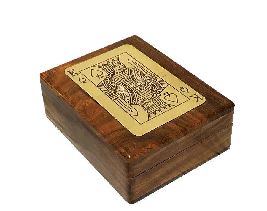 Kortlek elegant paketerad i en helt underbar liten ask av tillverkad av sheeshamträ, med metall dekoration på locket. Bredd 11,5 cm, djup 9 cm, höjd 4 cm.