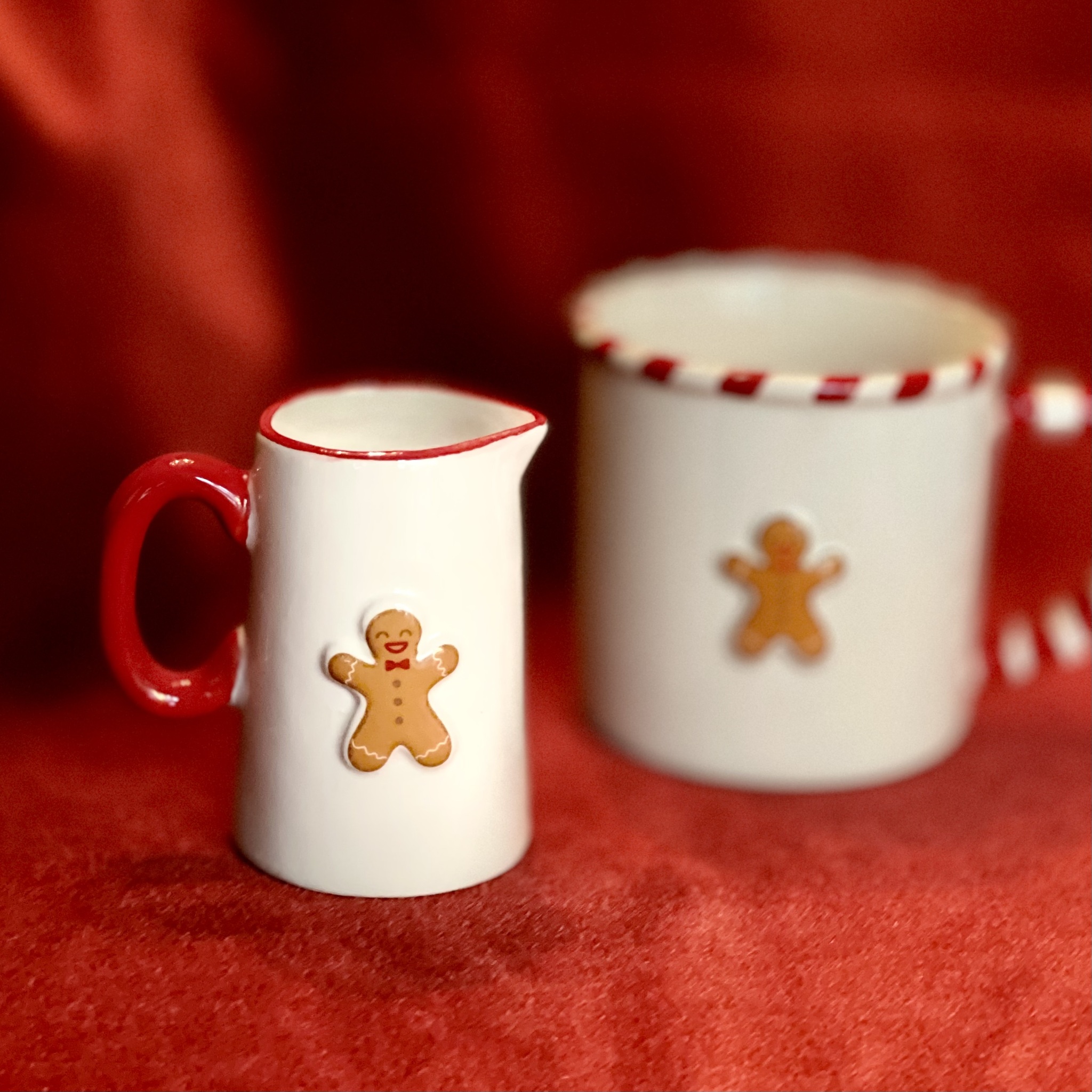 Alldeles bedårande liten kanna av stengods med pepparkaksgubbe i relief. Observera storleken, se andra bilden. Mått 8 x 8,5 x 5,5 cm.