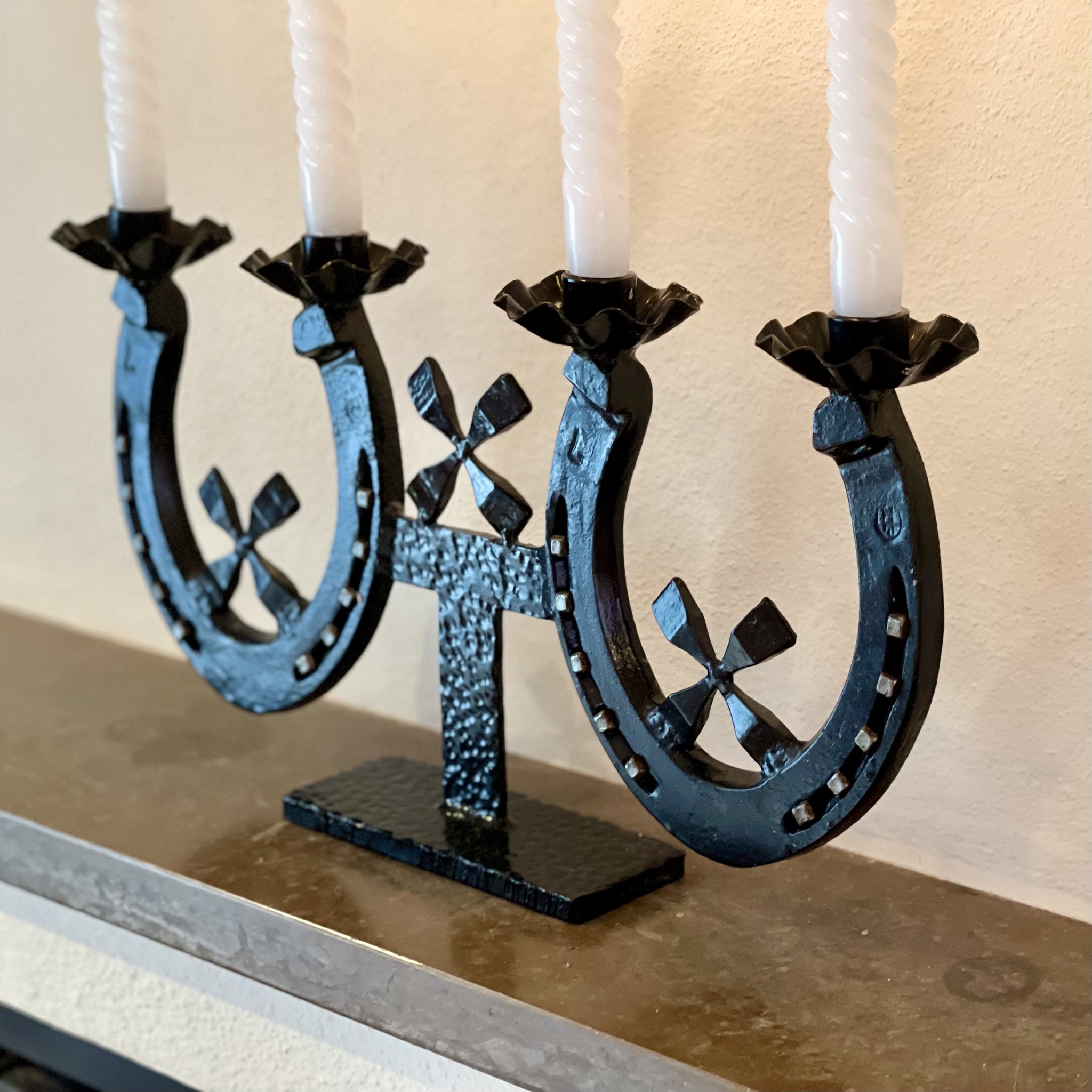 Tung och gedigen ljusstake av svartmålat järn med hästskor och hästskosöm, som gjord för hästälskaren och passar utmärkt som adventsljusstake. Höjd 22,5 cm, bredd 43 cm. Bruksslitage, finns vissa spår av stearin i ljuskopparna. Obs! Stearinljusen ingår ej.
