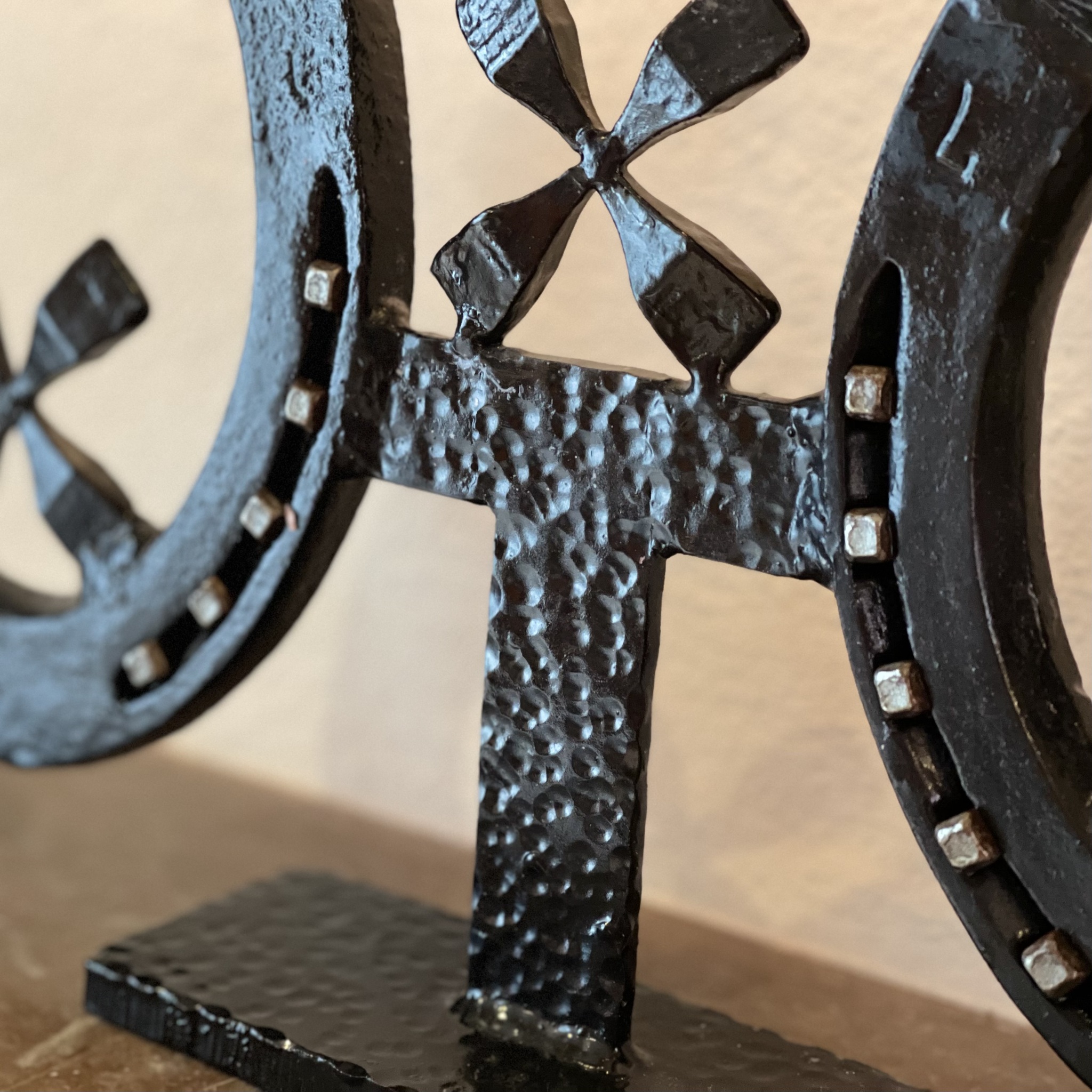 Ljusstake av svartmålat järn med hästskor och hästskosöm