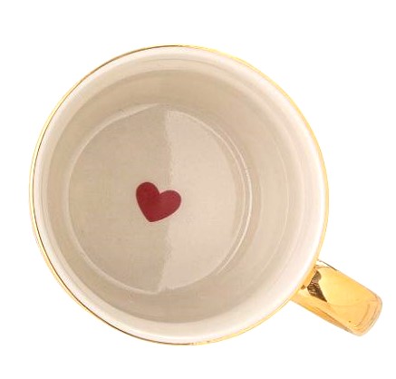 Gammaldags romantisk mugg med vackert rött mönster med små hjärtan och guldöra. Rymmer 300 ml. Handdisk, ej micro. Diameter 9 cm, höjd 8 cm.