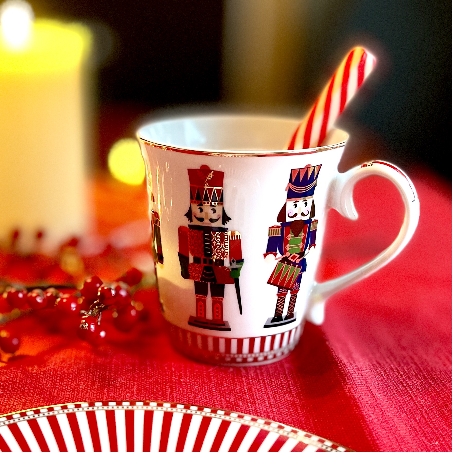 Underbar julmugg av porslin med stolta nötknäpparsoldater i vackra färger och med lyxig guldkant. Den nya tidens julporslin har helt enkelt nötknäppare på sig. Handdisk, ej micro. Höjd 9,5 cm, rymmer