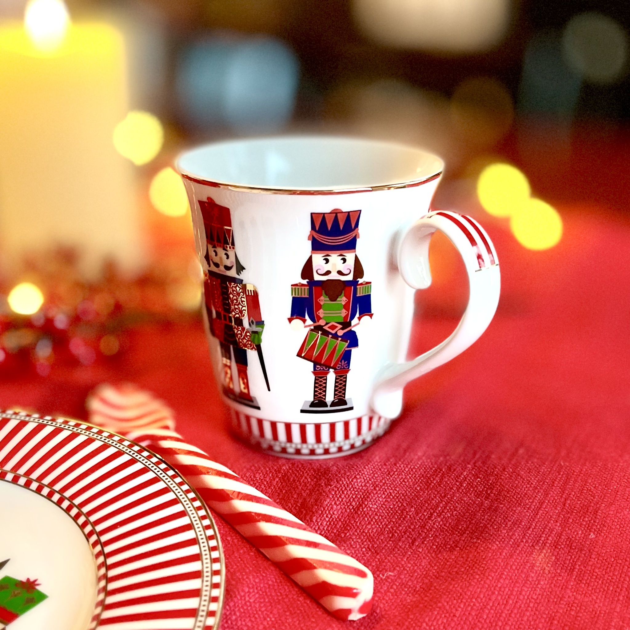 Underbar julmugg av porslin med stolta nötknäpparsoldater i vackra färger och med lyxig guldkant. Den nya tidens julporslin har helt enkelt nötknäppare på sig. Handdisk, ej micro. Höjd 9,5 cm, rymmer 275 ml.