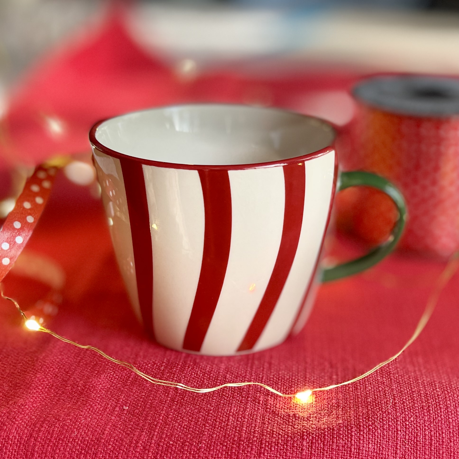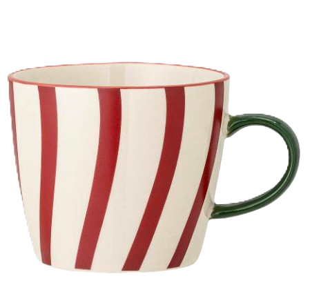 Rustik, festlig och polkagrisrandig julmugg av stengods. Matcha gärna med assiett och skål i samma serie, se avdelningen för tallrikar. rymmer 300 ml. Handdisk, ej micro. Diameter 9 cm, höjd 8 cm.