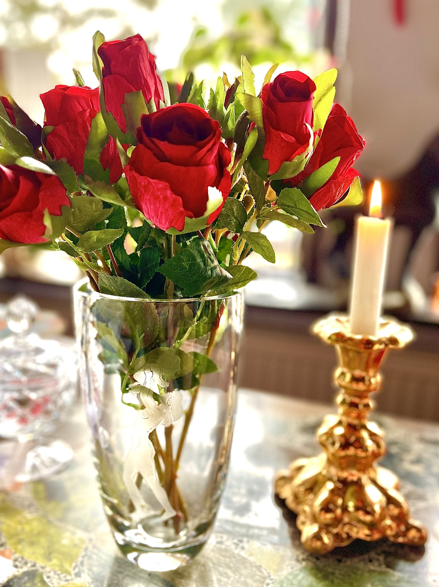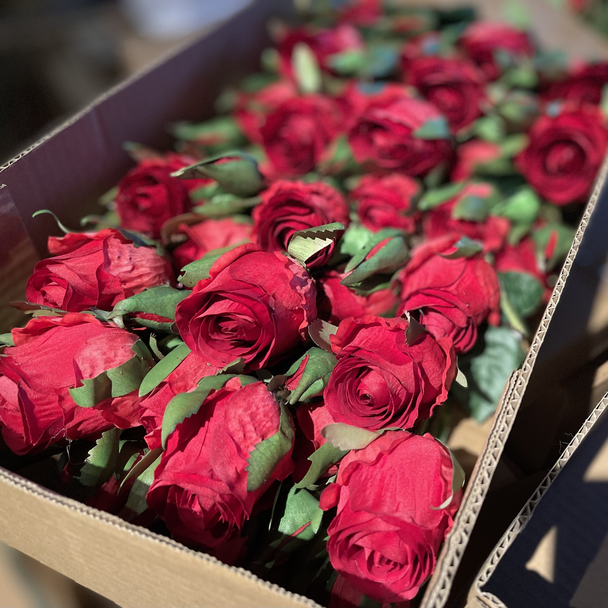 Visa din uppskattning och önska någon en GOD JUL med en konstgjord röd ros av absolut högsta kvalitet. Se sista bilden för hur blomman ser ut styckvis. Buketten på bild 2 innehåller sex stycken rosor.