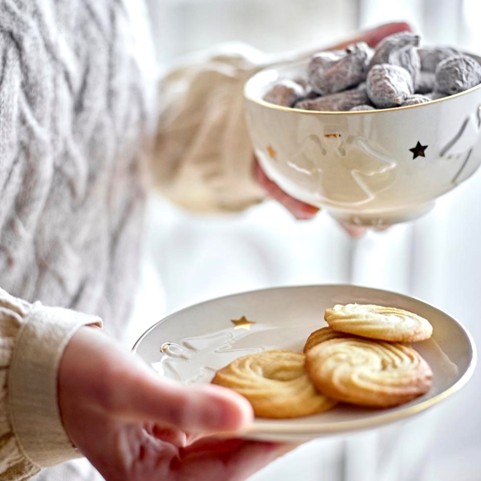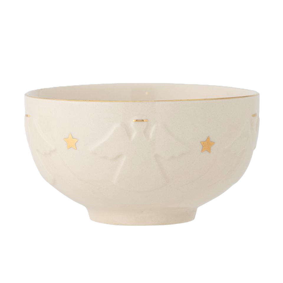 Matcha koppen och assietten i samma serie eller bara njut av den här vintervita skålen av stengods med gulddetaljer och änglar i relief. Handdisk rekommenderas, tål ej micro. Diameter 13,5, höjd 7,5 c