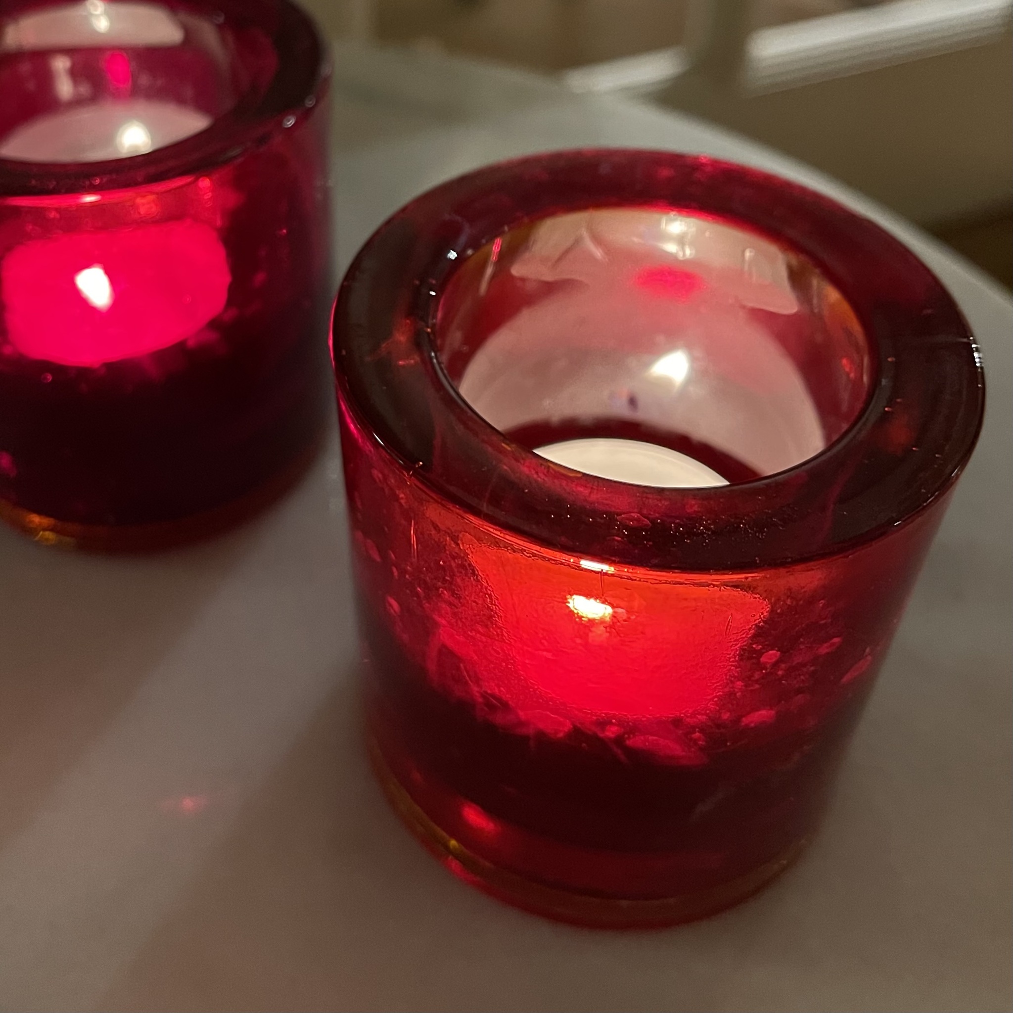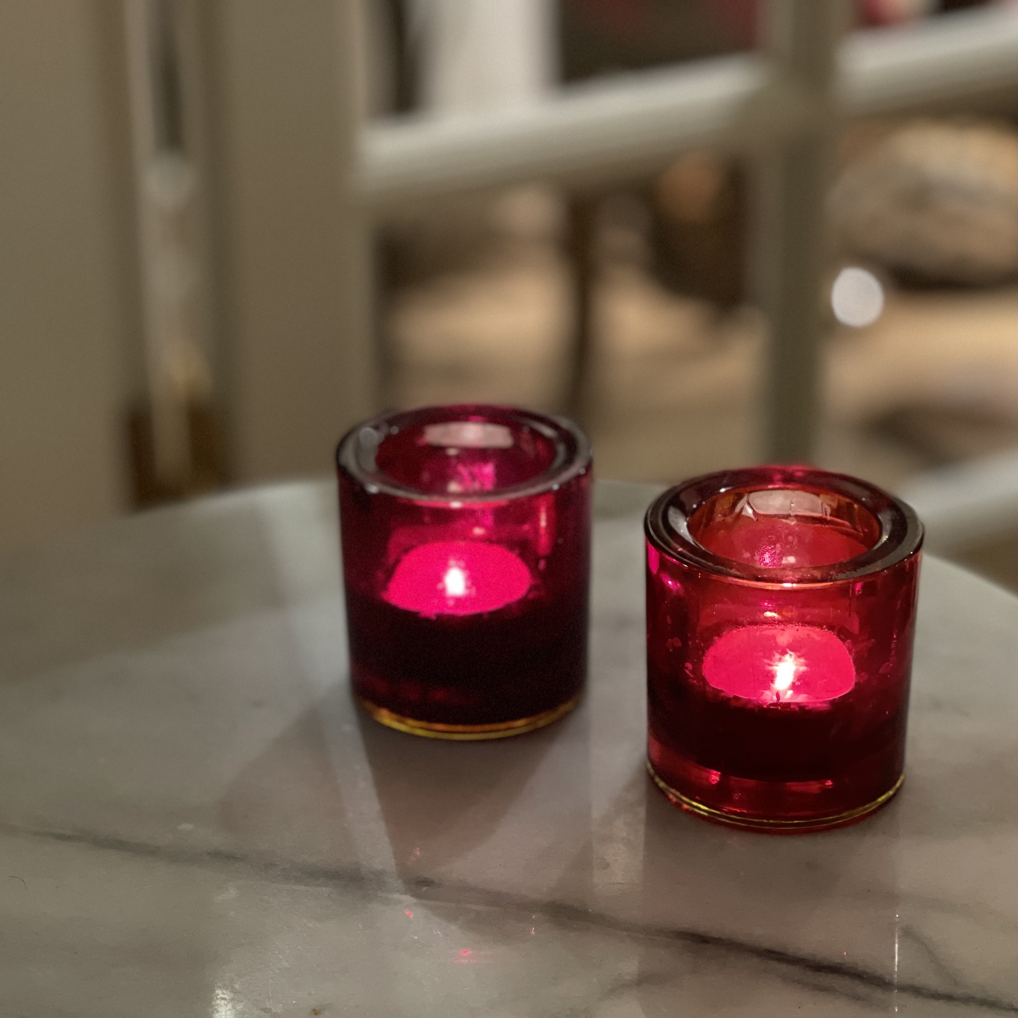 Som små rubiner är dessa två ljuslyktor av pressglas. Priset är för paret. Glaset är inte helt klart utan något grumligt. Höjd 7 cm.