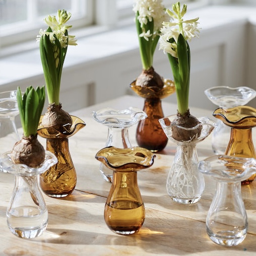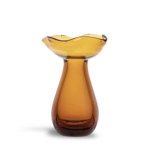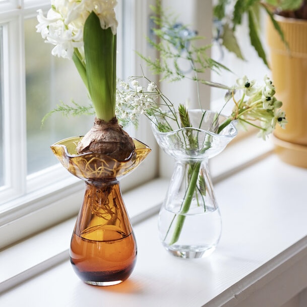 Hyacintlökarna ligger perfekt i den rundade toppen men också småblommor eller sticklingar står stadigt i den här underbara och handgjorda vasen. Bärnstensfärgen matchar alla dina juldekorationer. Tål diskmaskin. Höjd 14 cm, bredd 10 cm.