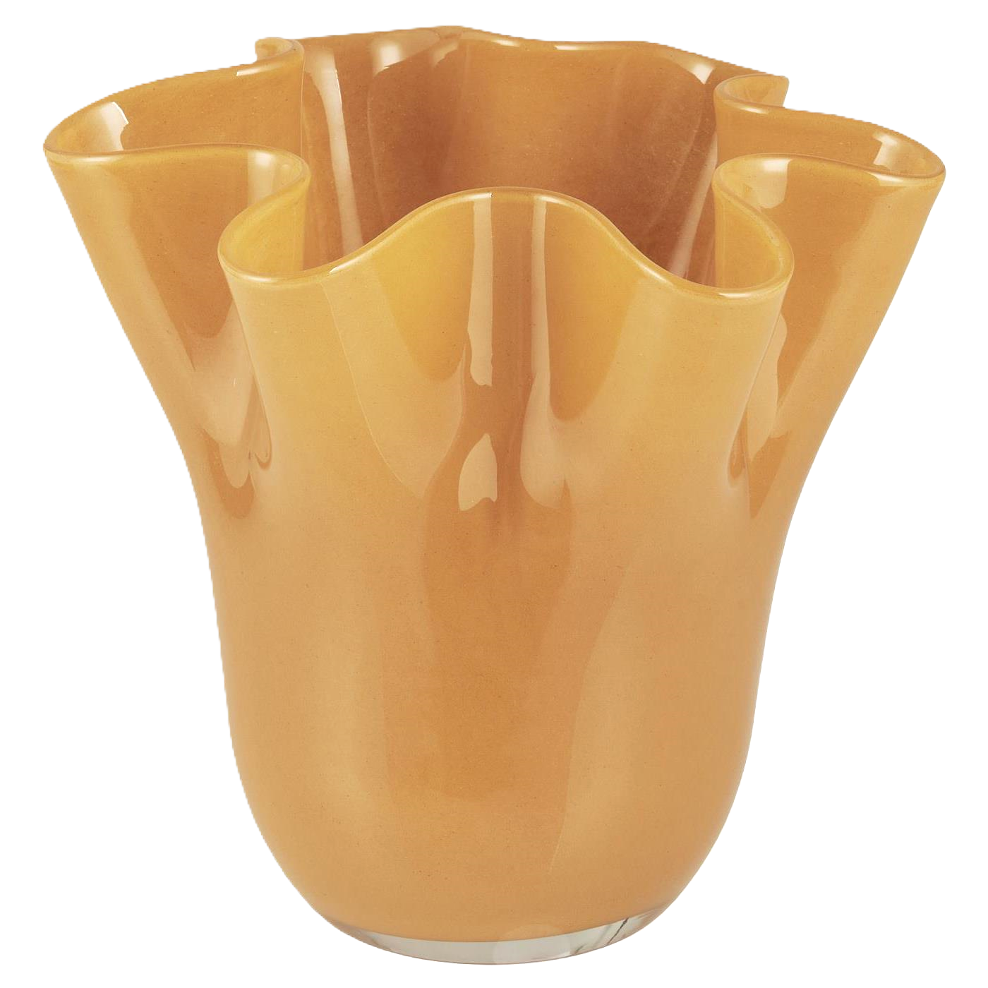 Den perfekta vasen i lyxigt guldig ockra som genom sin vågiga kant gör det extra lätt att arrangera sin bukett. Idealisk som tulpanvas eller varför inte till vintergröna kvistar på julbordet? Tillverkad av glas. Höjd 19 cm, diameter 17 cm.