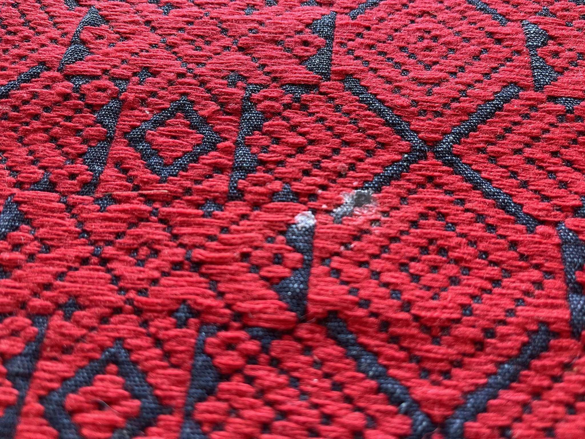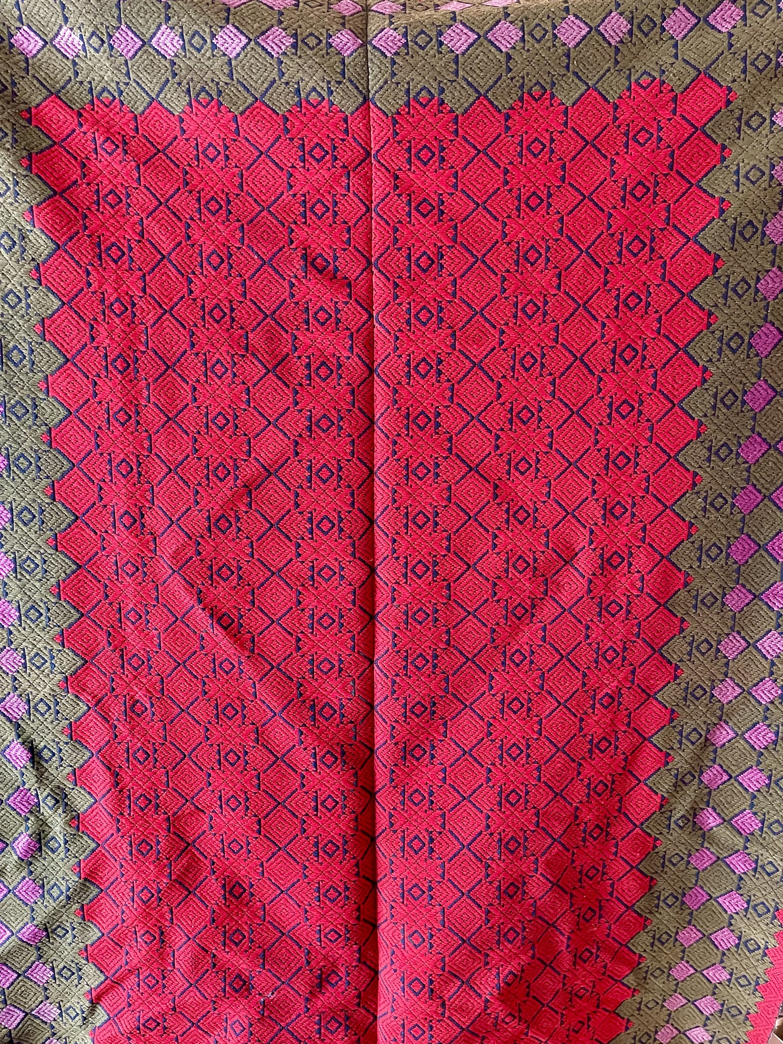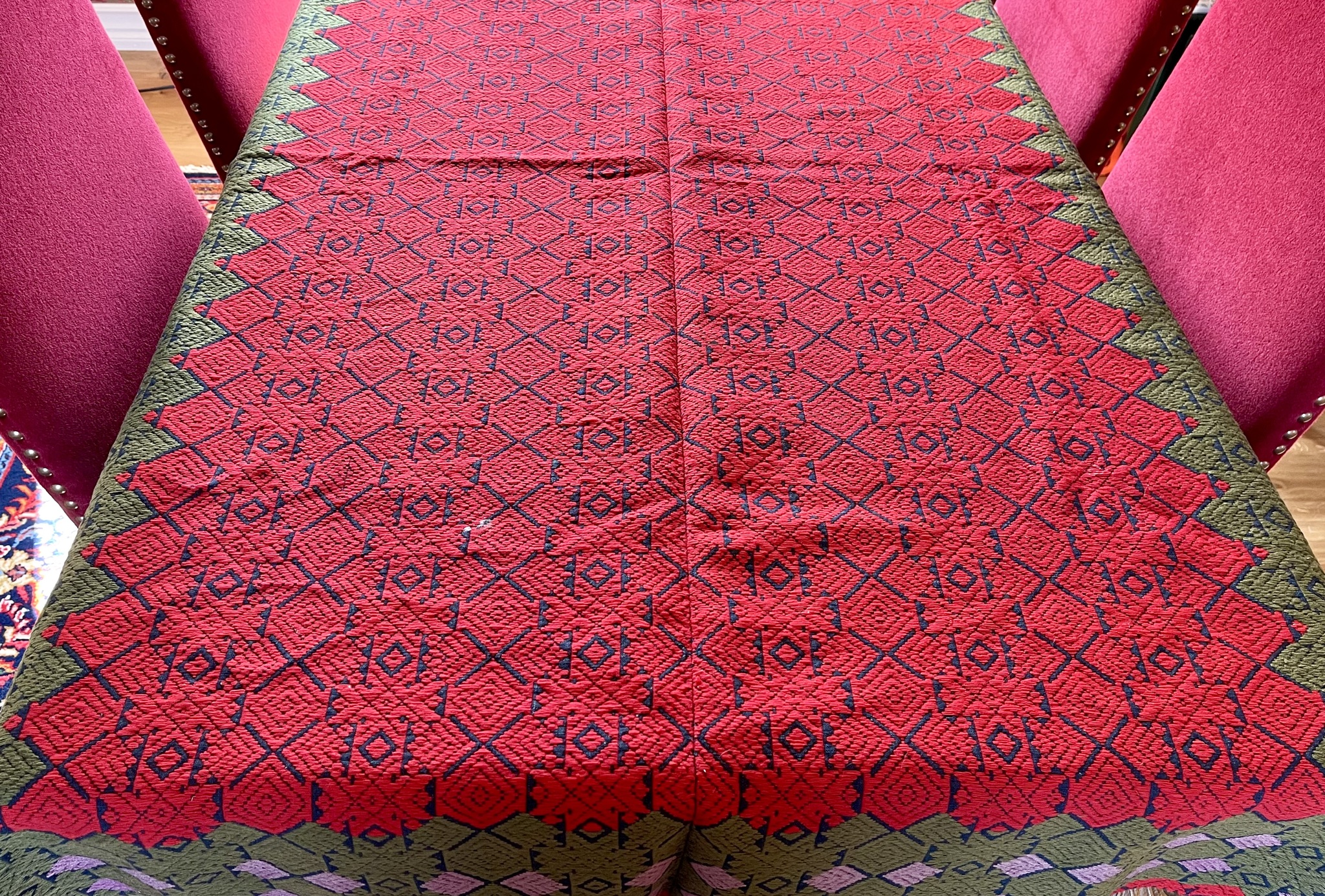 Bordsduk i kraftig väv med måtten 127×180 cm. Vävd i två stycken, söm/skarv på mitten. Liten odefinierbar fläck, se bild. För övrigt obetydligt bruksslitage.